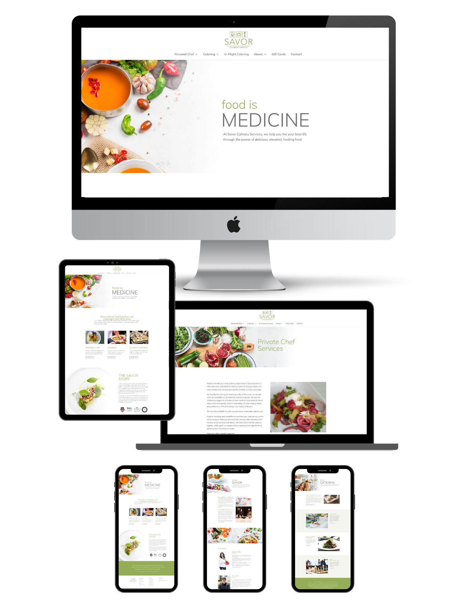 example from portfolio of thrive pr's chef and catering website design - shows large desktop, laptop, tablet and mobile phone images of the home page, which features beautiful, gourmet food plated on white plates